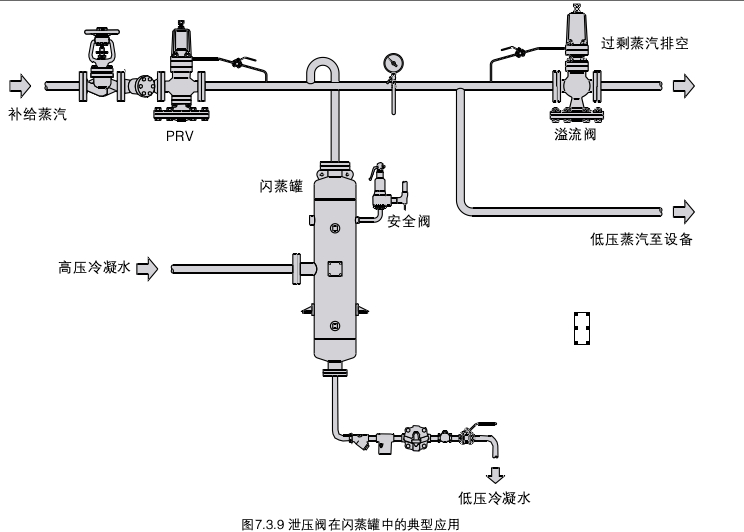 进口减压阀PRV2的排量应根据蓄热器设计运行的最大排放量和时间来确定,同时其设定差压应为蓄热器运行的最低压力和低压蒸汽(LP)的压差。在此例中,PRV2的设定开启压力为4.8 bar go 尸MV是稳压阀,它的口径由蓄热器所需的蓄热时间和锅炉在其蓄热过程中所能提供富余出力确定。蓄热时,经过尸MV的压力降相当小,因此尸MV的尺寸都比较大,一般与所安装的管道同口径。尸MV的设定压力一般仅比锅炉的最大设定压力低一点。 当全部用汽负荷小于锅炉出力时,PRV2关闭,锅炉经过PRV1向低压系统供汽,PRV1的设定压力要稍高于PRV2o锅炉富余的蒸汽会导致锅炉的压力上升并超过尸MV的设定点。尸MV打开向蓄热器蓄热。蓄热过程一直持续到蓄热器压力等于锅炉压力,或设备用汽负荷上升导致锅炉压力低于尸MV的设定压力。 如果低压蒸汽的负荷持续增加,导致蒸汽压力低于PRV2的设定压力。PRV2打开,蓄热器向低压系统供汽,补充从PRV1流过的蒸汽量。 设计蓄热器的设计安装方式有很多,并且成本也不相同。每一个都应根据实际应用确定,有关蓄热器的知识请参考第3.22节“蒸汽蓄热器”。 泄压阀(溢流阀) 泄压阀的作用是在控制和安全系统中,感应上游压力的能力可以用来将蒸汽系统中多余的压力泄掉。泄压阀本质上和稳压阀一样,当感应的上游压力升高时打开。当蒸汽直接排到大气中时,泄压阀有时也称为放空阀。 泄压阀通常用来控制闪蒸回收罐中的最大压力。如果闪蒸蒸汽的需求小于其供应,那么闪蒸的压力会上升进而打开泄压阀将多余的蒸汽排放到大气中。泄压阀的设定压力要低于安全阀的设定压力。 注意:尽管泄压阀可以控制排向大气的蒸汽量,但如果设备必须安装安全阀。泄压阀不能取代安全阀。在图7.3.9中,当闪蒸蒸汽的量不足时,可以通过减压阀从高压蒸汽(日尸)补充。泄压阀可以将多余的闪蒸蒸汽排入冷凝器或大气中。 安全阀应根据尸日V的全部排量加上上游进入闪蒸罐中的疏水阀的全部排量来选择。
