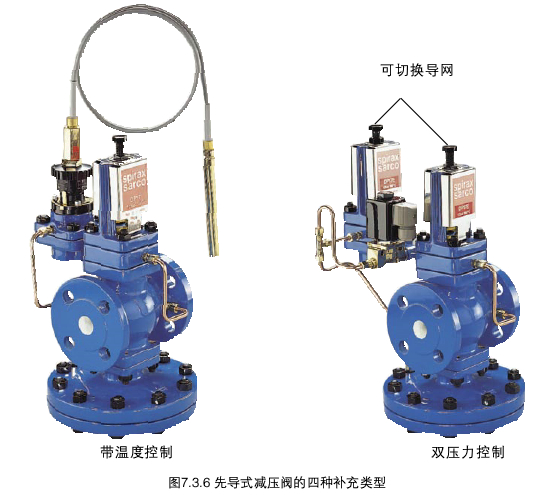 许多减压阀的问题都是由水分和杂质引起的。如果在减压阀上游安装了汽水分离器和细目(100目)的过滤器,则会防止此类问题的发生。过滤器应侧装以防止内部积水并保证滤网的全部面积都有效流通蒸汽。大口径的截止阀由于安装在过滤器下游也同样受益。 所有上下游的管道及其它附件都必须正确选型,以确保唯一的压降只在减压阀内产生。如果截止阀和减压阀同口径,它们会比正确选择的阀门产生更大的压降,正确的截止阀口径应该和上下游管道一样。 如果下游管道或所连接的设备不能承受上游蒸汽所产生的最大压力,那么在下游必须安装安全阀。该阀门应设定在等于或低于下游设备的最大允许工作压力,但应该有足够的余量高于其正常工作的压力。安全阀的排放能力必须大于减压阀在上游可能的最大压力下全开时的蒸汽流量。 先导式结构可以使减压阀在相同排量下比其它减压阀结构更紧凑,并且可提供其它控制方式,如开关式、双压力控制、压力和温度控制、减压和溢流控制以及远程手动调节等。这些衍变可以见图7.3.60 直接作用式和先导式控制阀可以用来控制上游或下游压力。稳压阀(和溢流阀)感应上游压力,而减压阀感应下游压力。