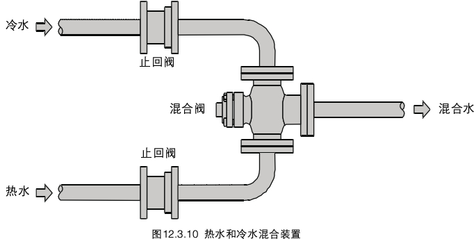口热水和冷水混合装置一止回阀应安装在每根供应管道上,防止流体倒流造成污染,如图12.3.10所示是一个普通的热水和冷水的混合装置。