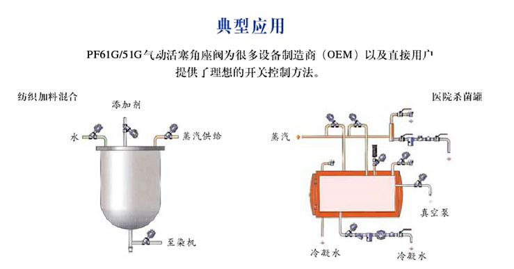 PF61G/S1G系列角阀结实、设i!一紧凑,PF61G本体为316L不锈钢、PFS1G本体为青铜,使川PTFE阀头密封确保紧密的关闭。自校正的PTFE `V'形阀杆密封提供了最大的密封效果。 提供常开和常闭两种标准};1号,也可提供川于双向流动和防水锤应川的特殊塑号。提供三种不同尺寸的执行器川于不同的应川。其它可供选择包括:流量调节器、电感行程开关、直接安装的电磁导阀。 本系列阀具有广泛的适川性,使川介质包括蒸汽、空气、中性气体、水、腐蚀性流体,最高使川范围可至2obar, 180℃。 气动角座阀使用优点 ┌─────────────────┐ │.可选青铜或316L不锈钢的阀体和阀盖 │ ├─────────────────┤ │} PTFE软密封,良好的密封 │ ├─────────────────┤ │.自校正的PTFE阀杆密封 │ ├─────────────────┤ │.可视的阀位指示 │ └─────────────────┘ ┌─────────────────┐ │.执行器可360。旋转 │ ├─────────────────┤ │.常开或常闭可选 │ ├─────────────────┤ │.防水锤或双向流动型号 │ ├─────────────────┤ │.角座、高流量设计 │ └─────────────────┘ ┌─────────────────┐ │.最高温度可以到1800 │ └─────────────────┘